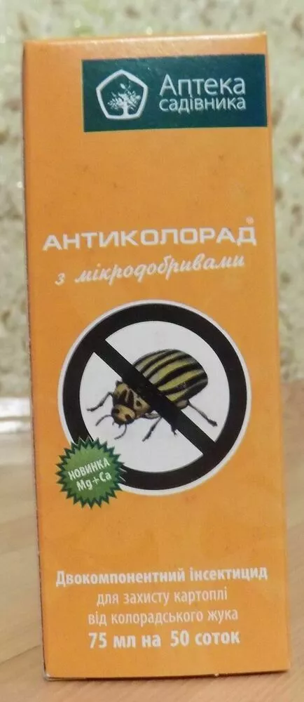 Двухкомпонентный инсектицид Антиколорад 75 мл – препарат смешанного действия, который применяется для защиты картофеля и других культур от колорадского жука и некоторых других вредителей. Обработку препаратом растений проводят в период вегетации. Обработку фруктовых деревьев проводят до и после цветения. Инсектицид Антиколорад 75 мл мы предлагаем купить по самой низкой цене в Украине с доставкой в любой населенный пункт. Преимущества инсектицида. Эффективная защита культур от колорадского жука, плодожорки, долгоносиков и других насекомых. Препарат не вызывает привыкания у насекомых. Защитный период действует долгое время. Препарат эффективно уничтожает как личинки, так и взрослых вредителей. Гибель насекомых происходит через несколько минут. Препарат безвреден для растения.