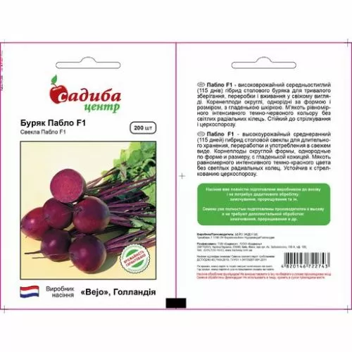 Сорт Пабло відноситься до середньоранніх. В цілому, вегетаційний період складає близько 90-110 діб. У гібрида прямостояча невелика розетка листя. Сорт досить стійкий до цветушние. Підходить для використання інтенсивних технологій, може вирощуватися на відкритому грунті. Коренеплоди майже ідеальною округлості, м'якоть плоду темно-червона, має трохи фіолетовий відтінок. Дуже соковита, смачна і ніжна. Коренеплоди даного типу важать 220-500 р.