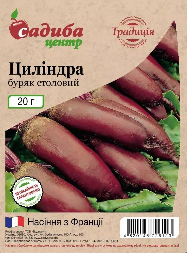 Буряк столовий Циліндра - середньостиглий високо урожайний сорт - 105-110 днів. Коренеплоди циліндричної форми, однорічні за розміром, мякотьнасиченого темно-червоного кольору, без кілець. Придатний для отримання, як раннього врожаю, так і пізнього для зберігання. Висівається в квітні. Схема висіву 45х8 см, глибина висіву 2-3 см. Сорт для використання у свіжому вигляді, зберігання і переробки.