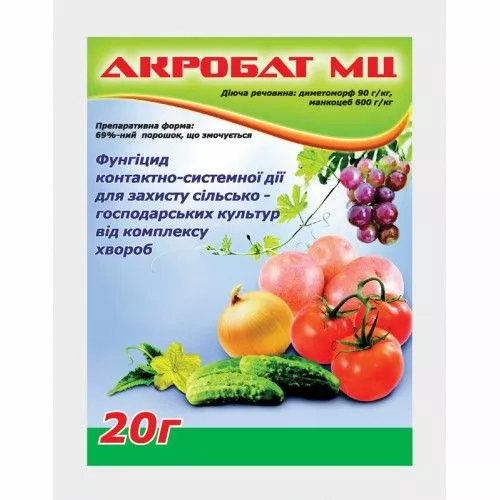 Акробат МЦ – системно-контактний фунгіцид застосовують для боротьби з альтернаріозом і фітофторозом картоплі, мілдью винограду, пероноспоріозом огірків і проти багатьох інших захворювань рослин.