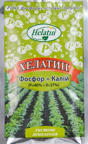Жидкое фосфорно-калийное удобрение ХЕЛАТИН (фосфор+калий) или Helatin создано для листовой подкормки растений с целью обеспечения их фосфором и калием, возвращения им здорового внешнего вида. Препарат характеризуется 40% содержанием фосфора и 27% содержанием калия.
