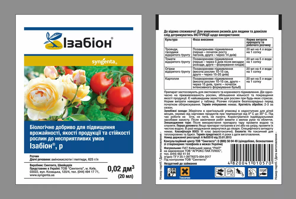 Ізабіон - це нове сучасне біологічне добриво тваринного походження. Ізабіон® складається з необхідних для швидкого росту й розвитку рослин повного спектра амінокислот та пептидів, на синтез яких рослина не витрачає додаткової енергії.