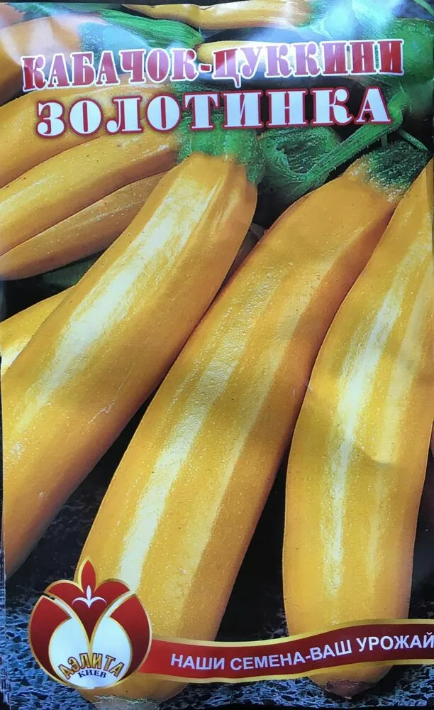 Кабачки «Золотинка» - кущовий сорт раннього дозрівання. Вони мають овальну форму. Можуть важити до 1,3 кг. Від інших представників сімейства гарбузових цей сорт відрізняється кольоровою гамою, оскільки має золотисто-жовтий колір. Їх шкірка тонка, м'якоть жовто-рожева і трохи солодка на смак. Рослини цього сорту відмінно себе почувають в суглинних грунтах, заправлених мінеральними і органічними добривами. Чудово ростуть на ділянках з гарною освітленістю, не люблять протягів.