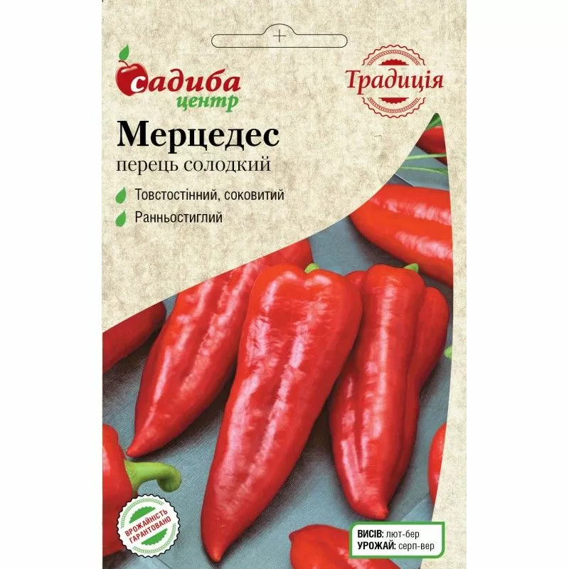 Перець Мерцедес - прекрасний середньоранній сорт для вирощування у відкритому та закритому ґрунті. Кущ висотою 60-65 см, формує великі (15-20 см), соковиті, товстостінні плоди з високим вмістом вітаміну С. Насіння висівають на розсаду в лютому-березні, а у віці 60-80 днів пересаджують у відкритий ґрунт. Сорт універсального призначення з винятково багатим смаком та ароматом.