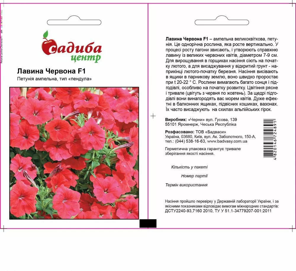 Ампельна велико квіткова, петунія. Це однорічна рослина, яка росте вертикально. У процесі росту пагони звисають, і утворюють справжню лавину із великих червоних квітів, діаметром 7-9 см. Для вирощування в горщиках насіння сіють на початку лютого, а для висаджування у відкритий грунт - наприкінці лютого-початку березня. Насіння висівають в ящики в парникову землю, воно швидко проростає при t 20-22 ° С. Рослини вимагають багато сонця і підгодівлі, особливо на початку розвитку. Цвітіння рясне і тривале (цвітуть з червня по жовтень). За щедрі підгодівлі вони винагородять вас морем квітів. Дуже ефектні в балконних ящиках, підвісних кошиках, вазонах. Їх часто висаджують на схилах альпійських гірок.