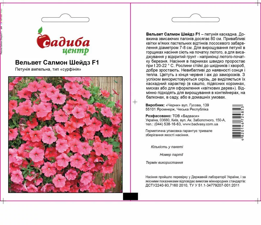 Петунія Вельвет Салмон Шейдз - петунія каскадна. Довжина звисаючих пагонів досягає 80 см. Привабливі квітки м'яких пастельних відтінків лососевого забарвлення діаметром 7-8 см. Для вирощування петунії в горщиках насіння сіють на початку лютого, а для висадки у відкритий грунт - в кінці лютого-початку березня. Насіння в парниках швидко проростають при t 20-22 ° С. Рослини стійкі до шкідників і хвороб, добре ростуть. Невибагливі до наявності сонця і тепла. Цвітуть з кінця червня і до заморозків. Дуже добре підходять для вирощування в контейнерах, на балконах, в саду або в домашніх умовах.