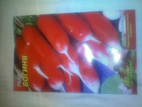 Насіння редиски Богиня - це високоврожайний, ранньостиглий сорт, від посіву до збору 16-20 днів. Відносно стійкий прости посухи, висока товарність 87%. Коренеплід довжиною 6-8 см., яскраво-червоний з білим кінчиком. Призначений для вирощування у відкритому грунті і під плівкою. Висівають рано навесні в декілька строків через 10-12 днів, літній посів проводять в кінці липня - на початку серпня. Холодостійка культура, переносить заморозки до -2-3 градусів. Найкраща температура для росту 18-20 градусів.