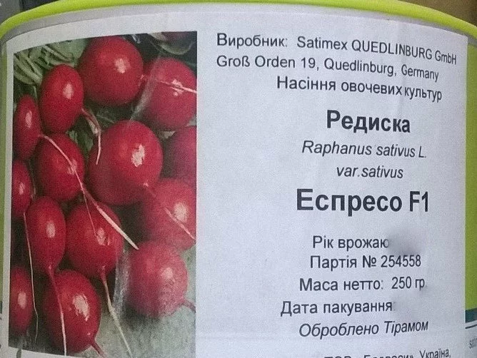 Еспресо F1 – надранній гібрид (термін дозрівання 18 днів після сходів). Коренеплід круглий, матово-червоного кольору, середнього розміру, діаметром 2,5 – 3,0 см. М’якуш білий, соковитий, хрусткий. Розетка листків некрупна, прямостояча. Всі коренеплоди однакової форми та розміру. Призначений для вирощування у весняний та осінній періоди. При вирощуванні відмінний ефект дає укриття посівів агроволокном – сходи більш ранні, виключно дружні, немає уражень хрестоцвітною мухою та блішкою.