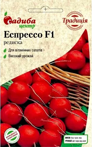 Еспресо F1 – надранній гібрид (термін дозрівання 18 днів після сходів). Коренеплід круглий, матово-червоного кольору, середнього розміру, діаметром 2,5 – 3,0 см. М’якуш білий, соковитий, хрусткий. Розетка листків некрупна, прямостояча. Всі коренеплоди однакової форми та розміру. Призначений для вирощування у весняний та осінній періоди. При вирощуванні відмінний ефект дає укриття посівів агроволокном – сходи більш ранні, виключно дружні, немає уражень хрестоцвітною мухою та блішкою.