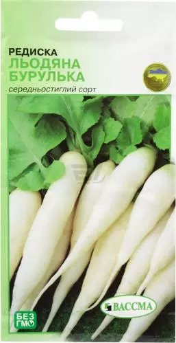 Коренеплід білого забарвлення, видовжено-циліндричної форми (типу льодяна бурулька). М'якуш білий, ніжний, соковитий, смак середньо-гострий.