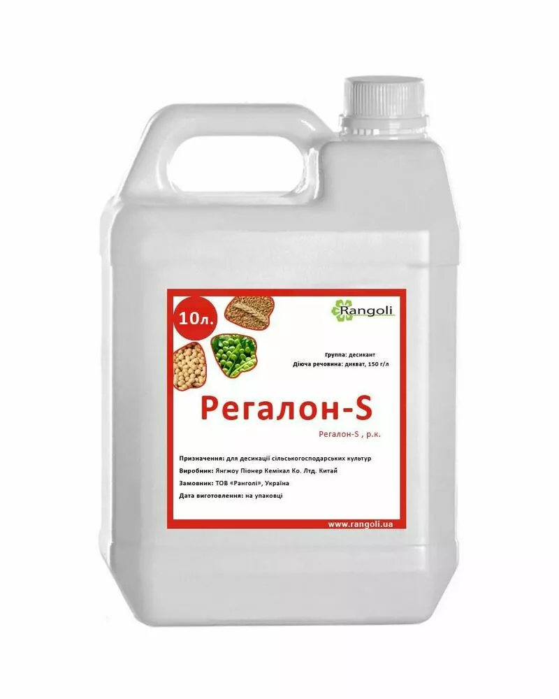 Регалон-S, 15% в.р. контактний десикант, що не володіє системною дією. Речовина, що діє, дикват необоротно зв’язується рослинними тканинами, порушуючи процес фотосинтезу. Внаслідок реакції утворюється перекис водню, клітинні стінки руйнуються, що дає змогу воді швидко випаруватися. Обробку краще проводити ввечері або вдень у хмарну погоду тому, що під дією ультрафіолетових променів перекис водню розкладається.
