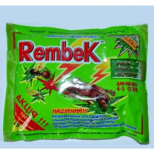 Рембек (125гр) - готовая приманка для борьбы с медведкой (волчком, капустянкой), дротянкой и личинкой хруща. Надежно защищает: овощные (картофель, томаты, огурцы, баклажаны), цветочные, ягодные (клубника, малина и др.) культуры.