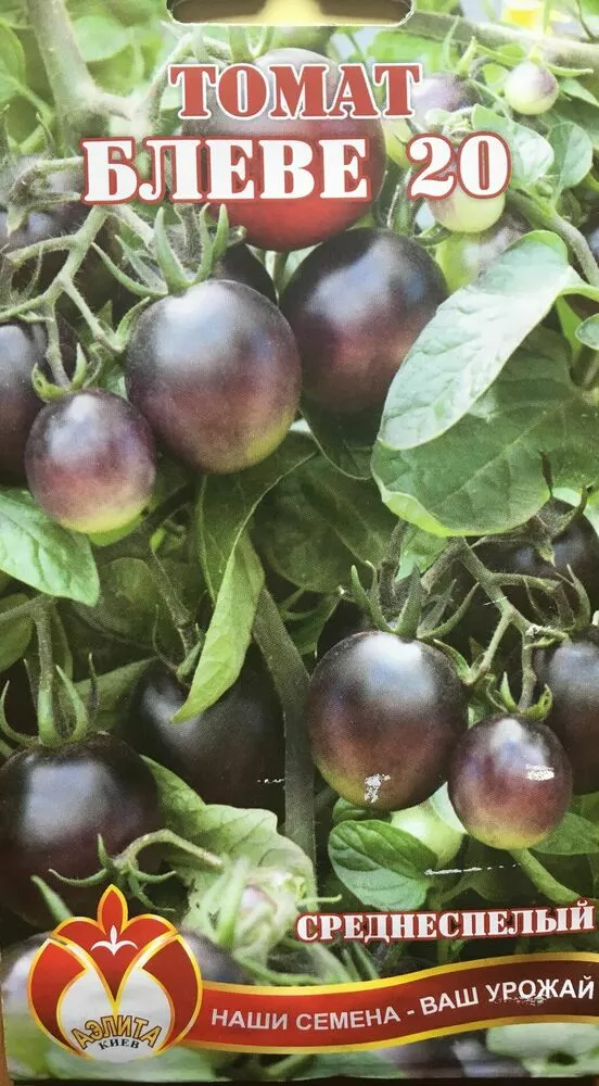 СЕРЕДНЬОСТИГЛИЙ - 105-115 ДНІВ. «Bleve P-20» - незвичайний середньостиглий сорт з США. Кущ висотою 1,5 м, вирощується в 2 стебла. Китиця багатоплідна з 5-8 великими фіолетово-синіми плодами масою 50-80 г. Смак плодів солодкуватий. Мають підвищений вміст вітаміну C. Фіолетове забарвлення томатів з'являється під прямими променями сонця, в тіні плоди будуть менш темними або червоно-бурими. Усередині м'якоть червоно-рожева, щільна, ароматна. Урожайність висока. Призначення сорта салатово-консервне.