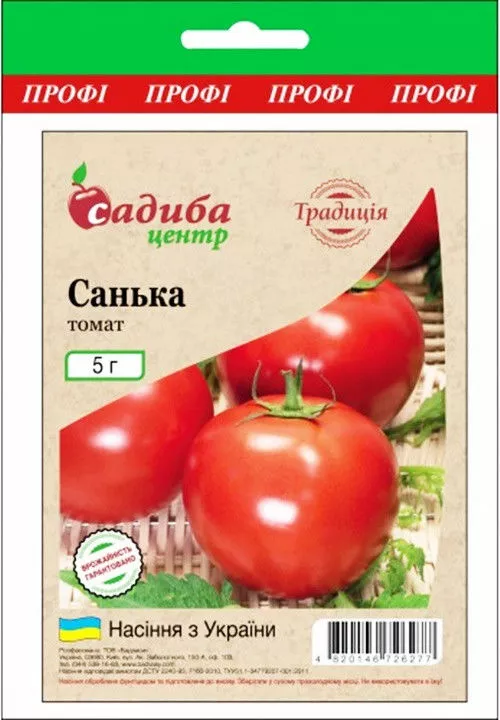 Томат Санька - дуже ранній і по-спартанськи невибагливий сорт, з яким ви легко отримаєте високий урожай. Рослина компактна, висотою до 60 см, толерантне до ряду захворювань, в тому числі - до фітофторозу. Плоди округлі, червоно-гарячого кольору, з щільною м'якоттю, дуже ароматні і солодкі. Вирощувати краще розсадним способом: на початку травня у відкритий грунт висаджують 50-60-денну розсаду. Сорт чудовий як для свіжого споживання, так і для консервування.